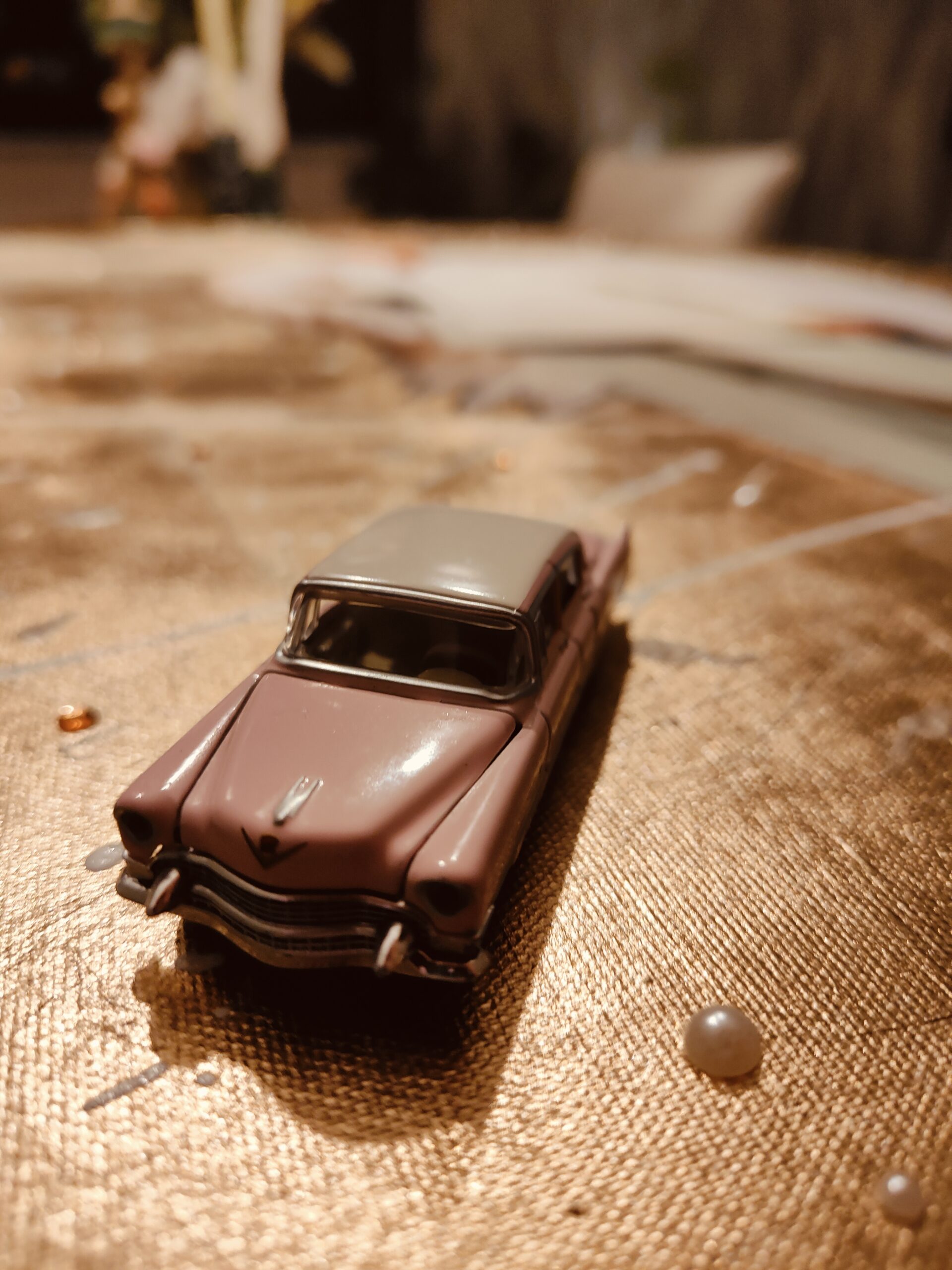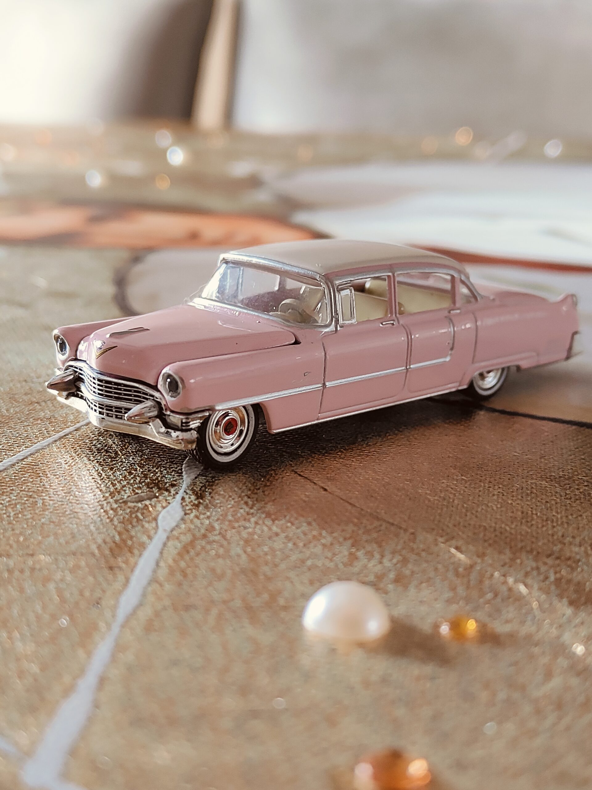 Elvis, als engel met kroon.  Omrind door -met de hand aangebracht- bladgoud en fijne steentjes. Compleet met metalen uitvoering van zijn eigen Cadillac Fleetwood.